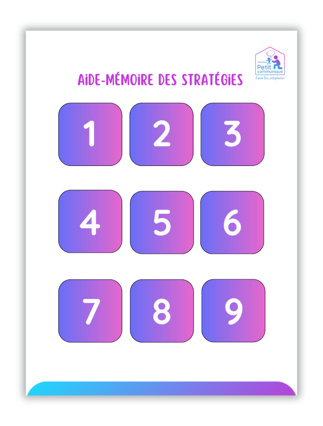 Un aide-mémoire visuel à imprimer, clair et épuré, qui vous rappellera les stratégies les plus puissantes vues dans la formation. À afficher sur le frigo ou dans l’aire de jeu pour ne jamais perdre de vue l’essentiel.