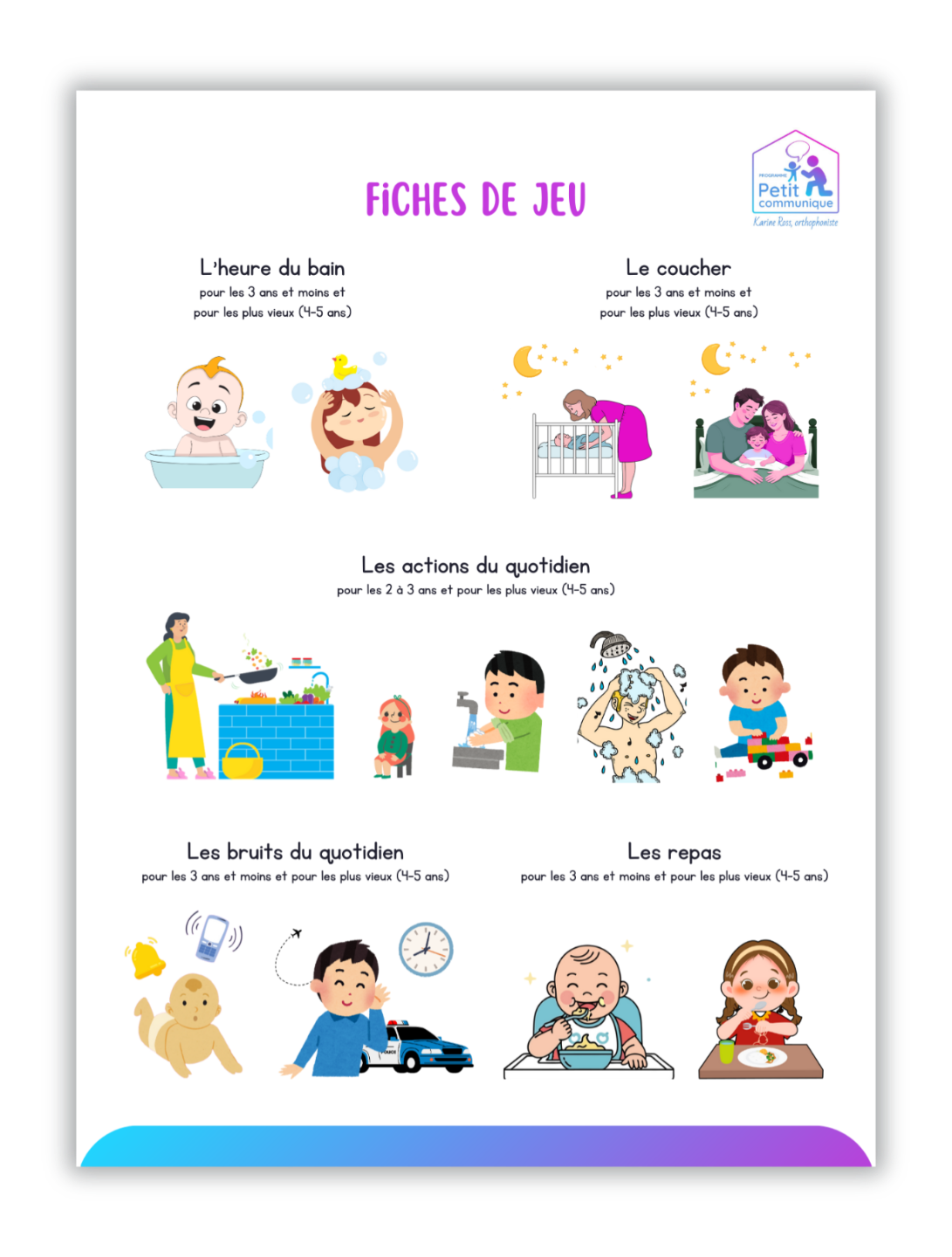 Des activités simples, amusantes et sans matériel, que vous pourrez faire avec votre enfant et qui s’imbriqueront facilement dans votre quotidien. Chaque fiche est conçue pour stimuler le langage… sans que l’enfant ne s’en rende compte !